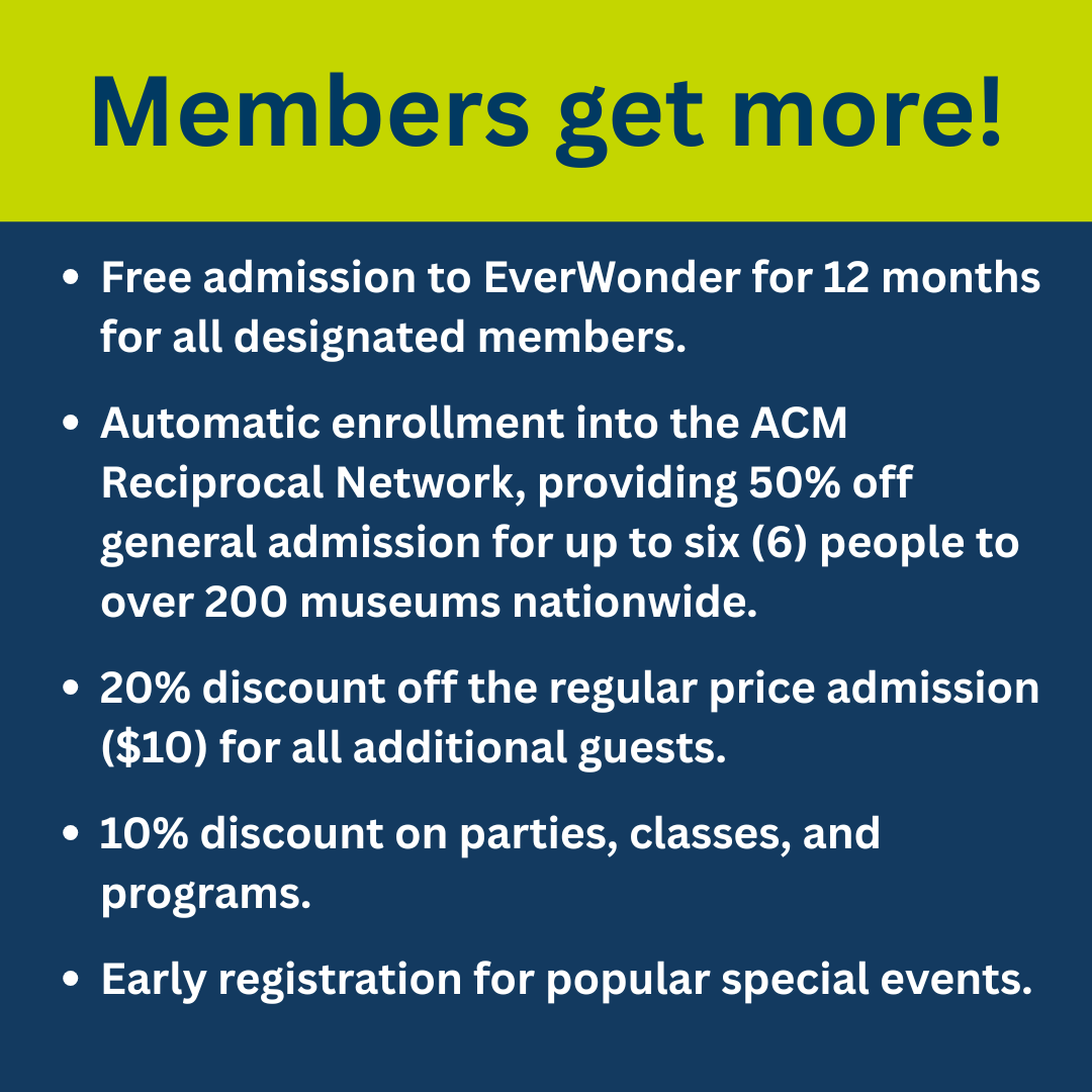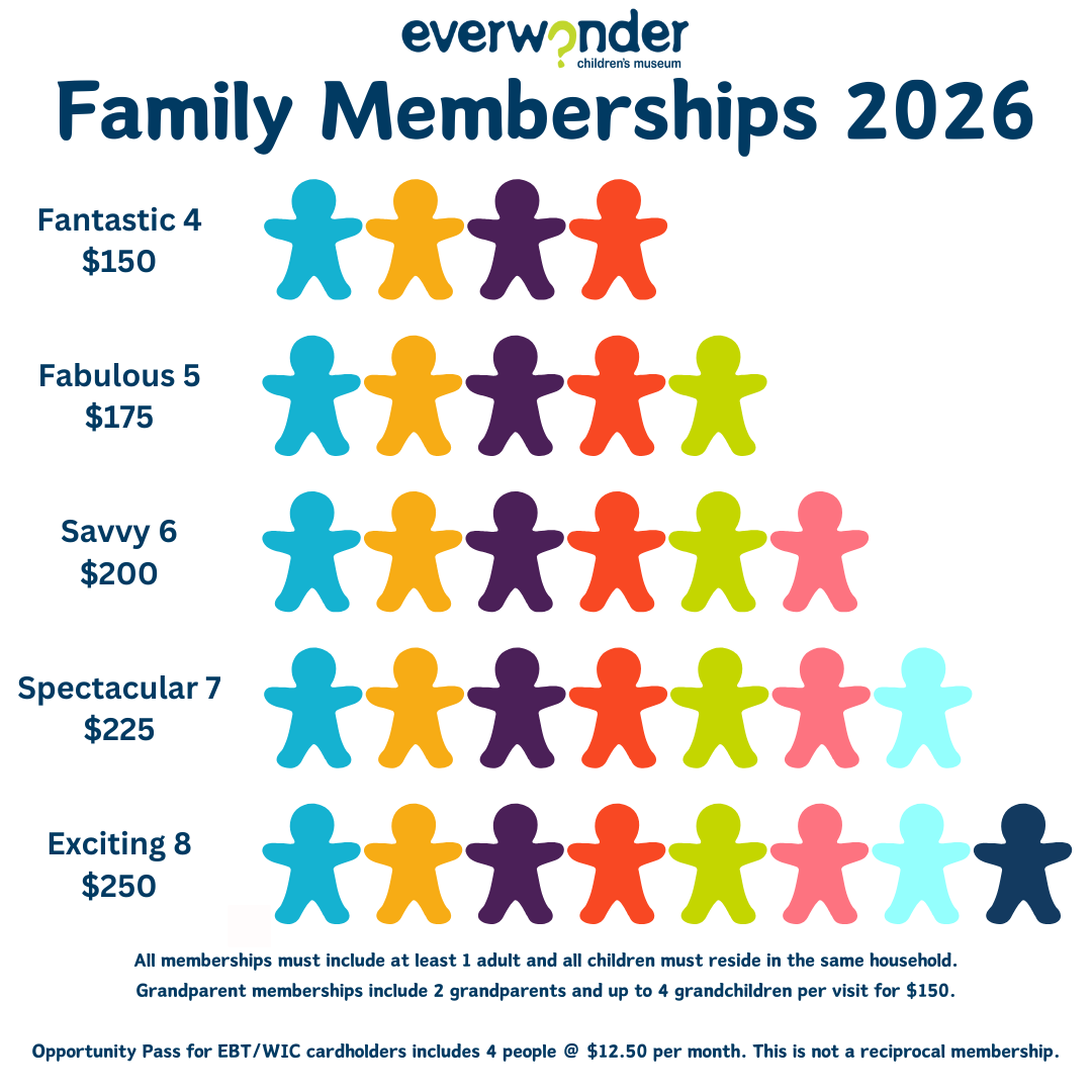 Members help sustain the EverWonder Children’s Museum’s mission to instill in children a life-long love of learning in STEM. We know that families come in all shapes & sizes, so we’ve updated our membership levels to make it easier for you!
