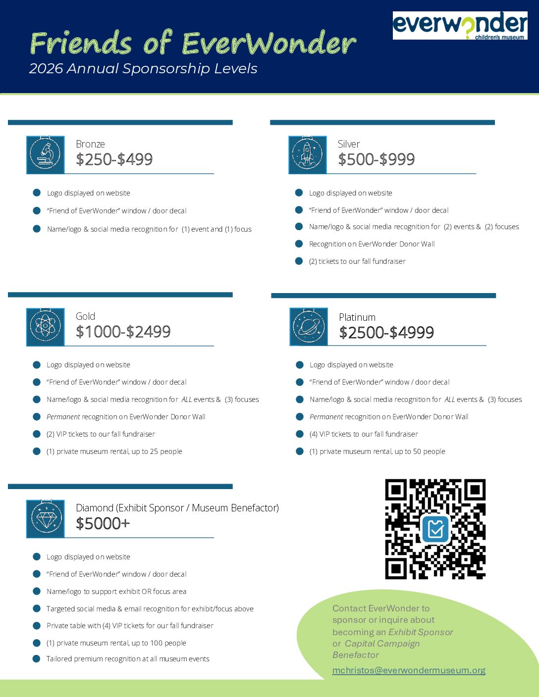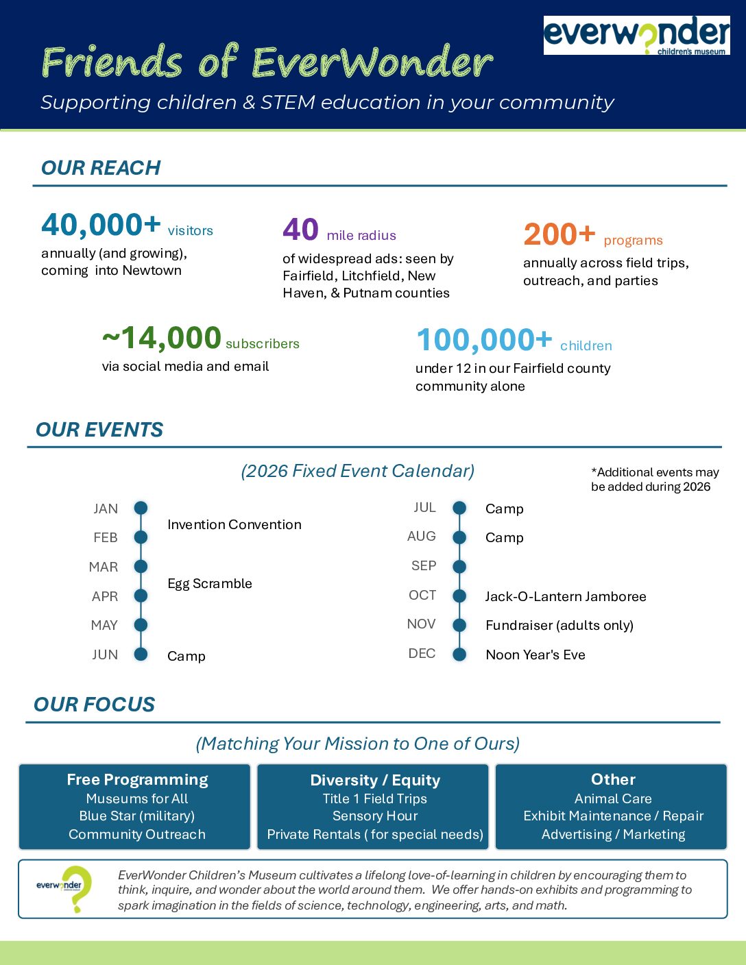 OR have a background in education, STEM, fundraising, or corporate America? Ask us about joining our board of directors! Email our Director at mchristos@everwondermuseum.org